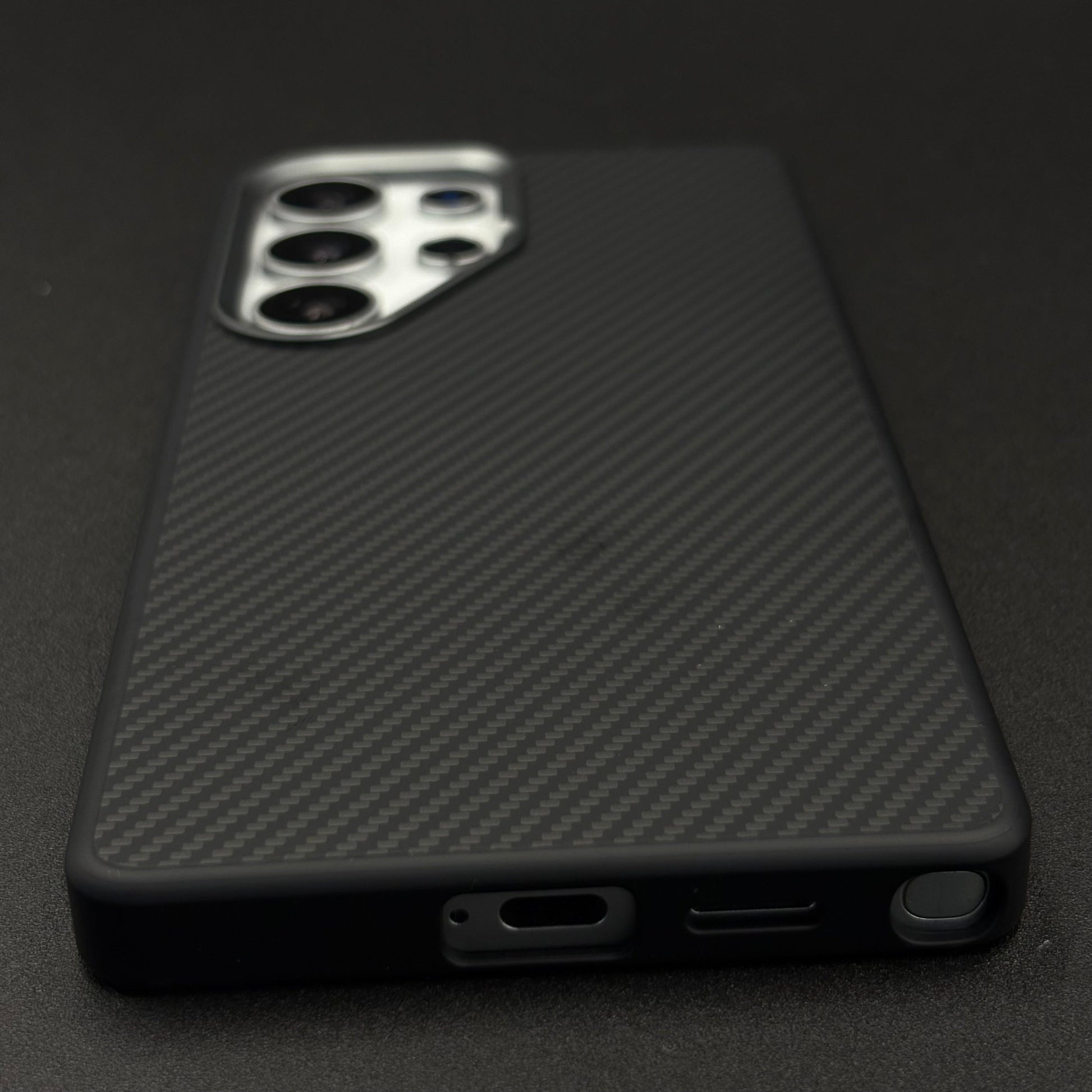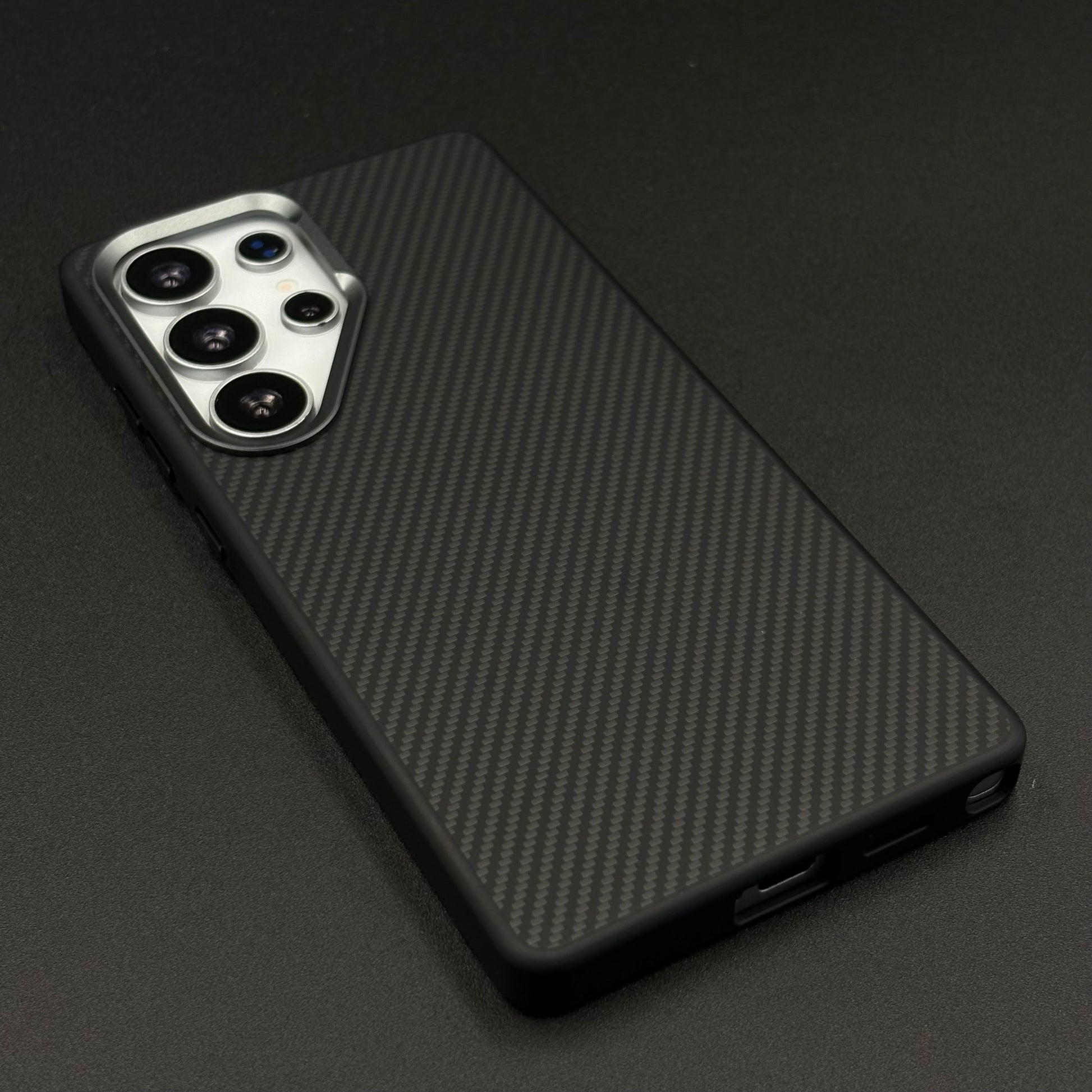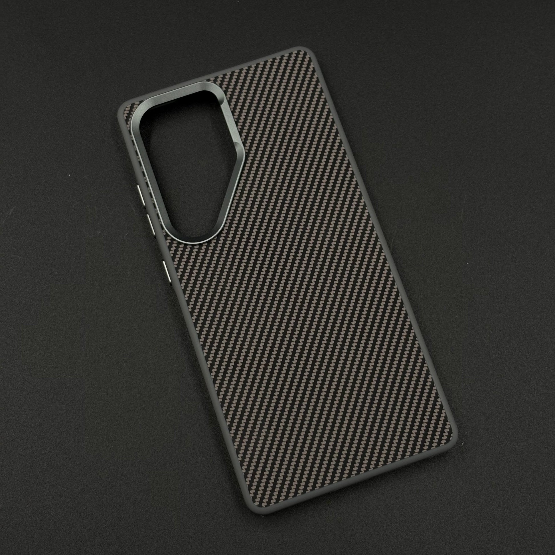 A sleek, futuristic case for the Galaxy S24 Ultra featuring a hidden Magsafe ring beneath the textured carbon fiber surface, enhanced with a protective metallic camera frame for a premium, minimalist look.