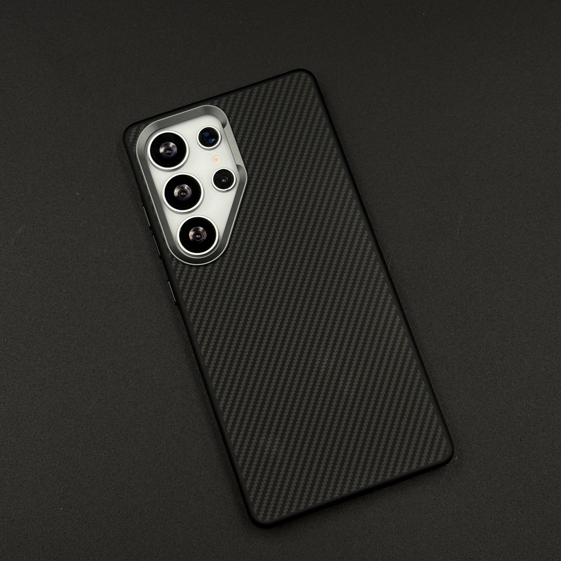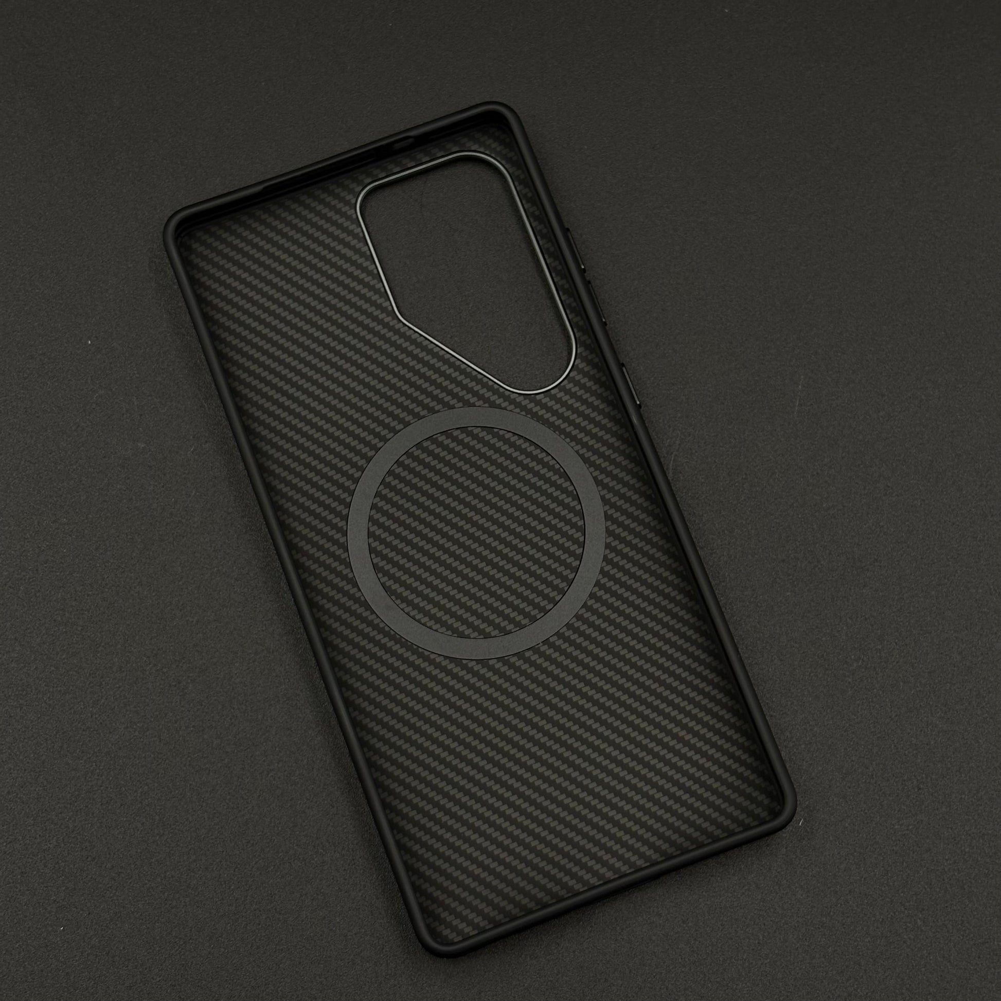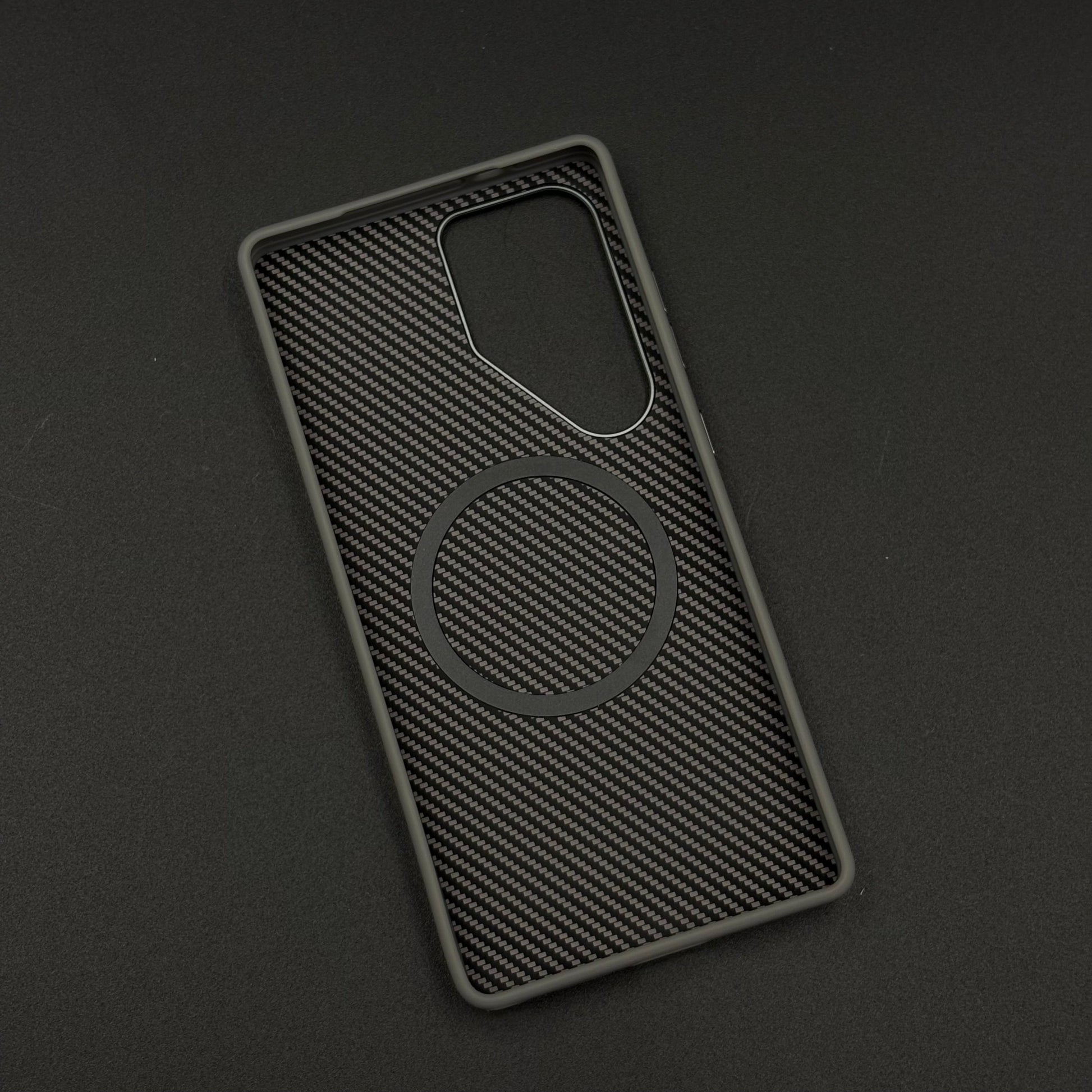 A sleek, futuristic case for the Galaxy S25 Ultra featuring a hidden Magsafe ring beneath the textured carbon fiber surface, enhanced with a protective metallic camera frame for a premium, minimalist look.