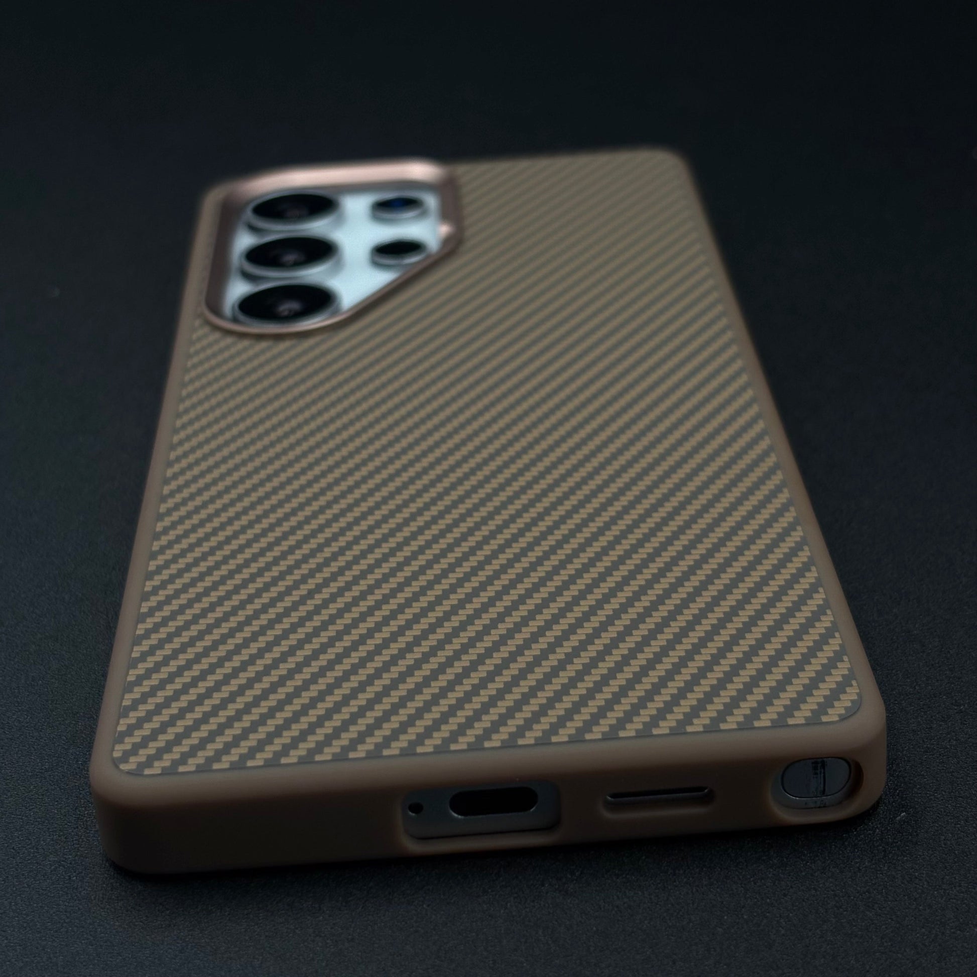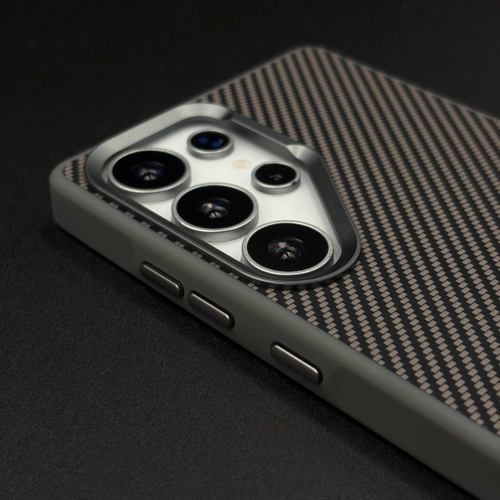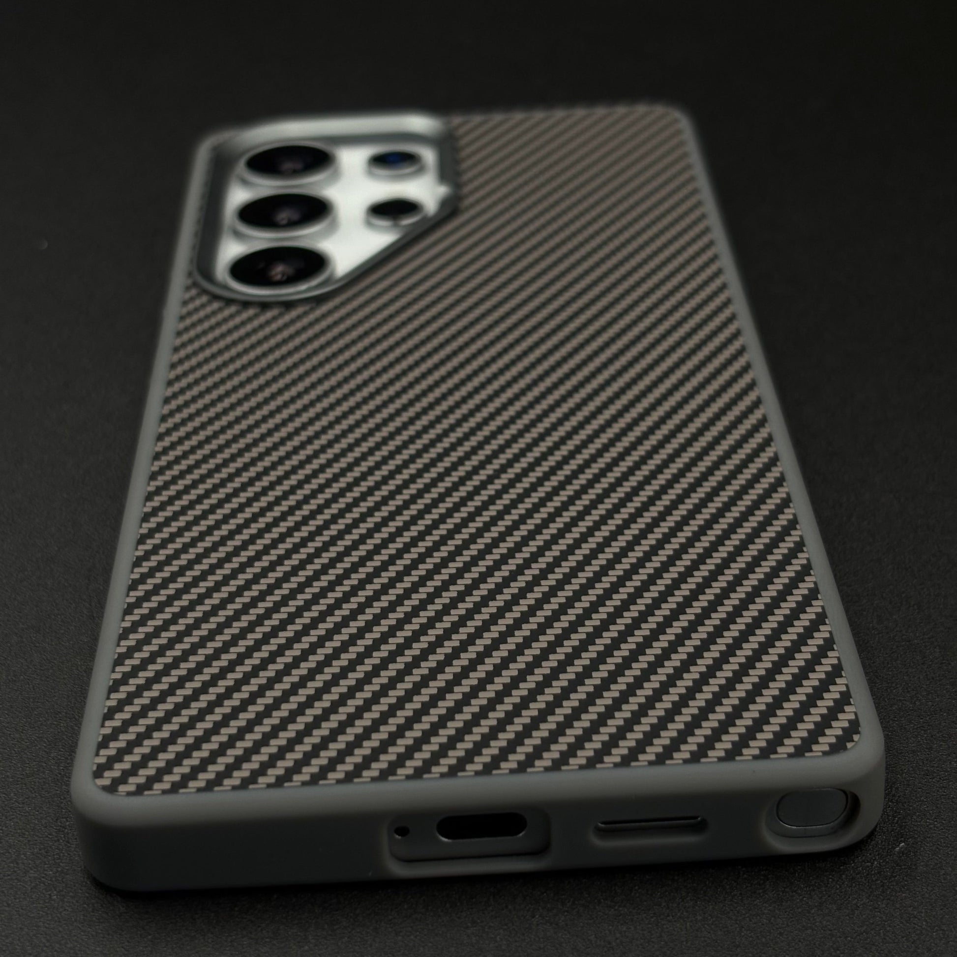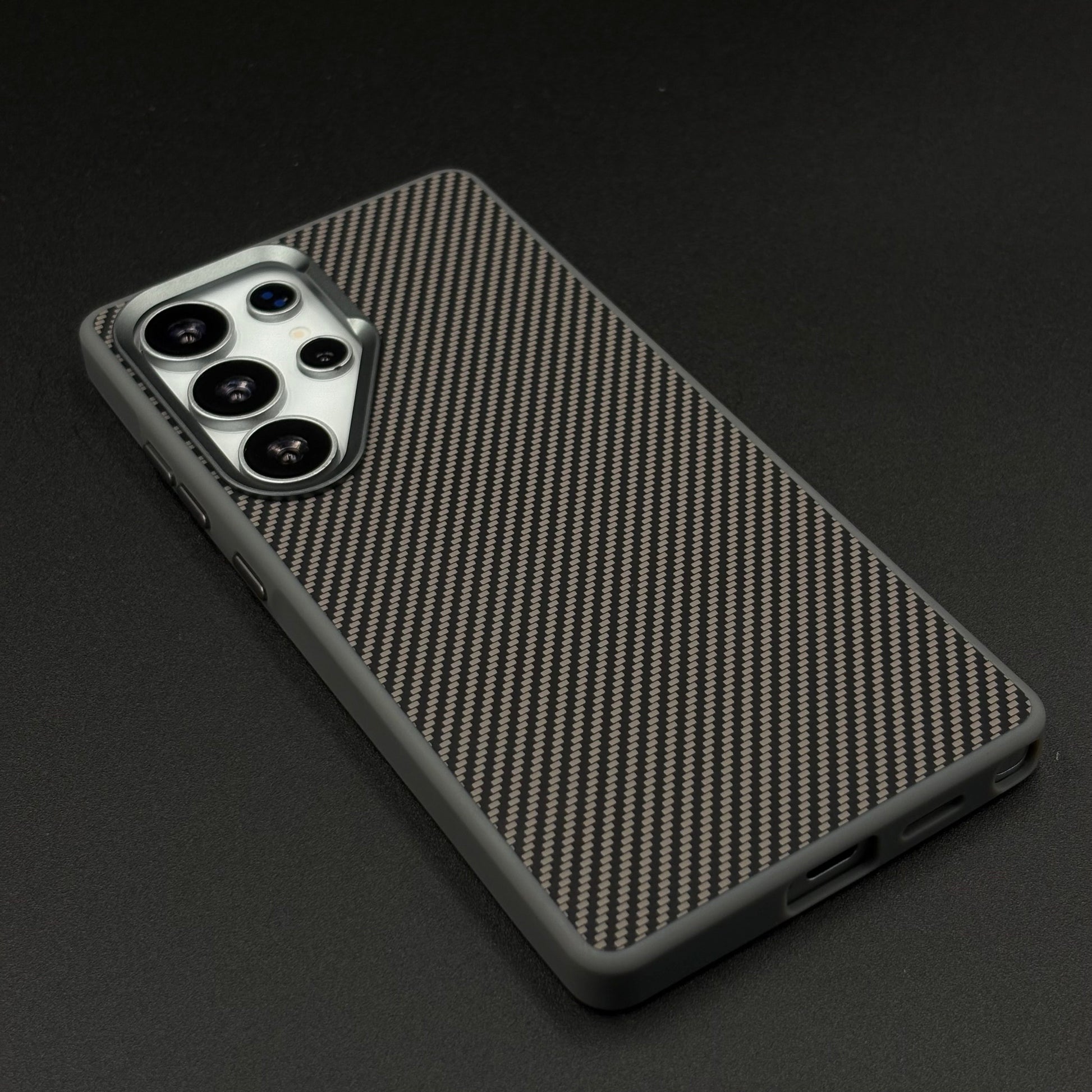A sleek, futuristic case for the Galaxy S25 Ultra featuring a hidden Magsafe ring beneath the textured carbon fiber surface, enhanced with a protective metallic camera frame for a premium, minimalist look.