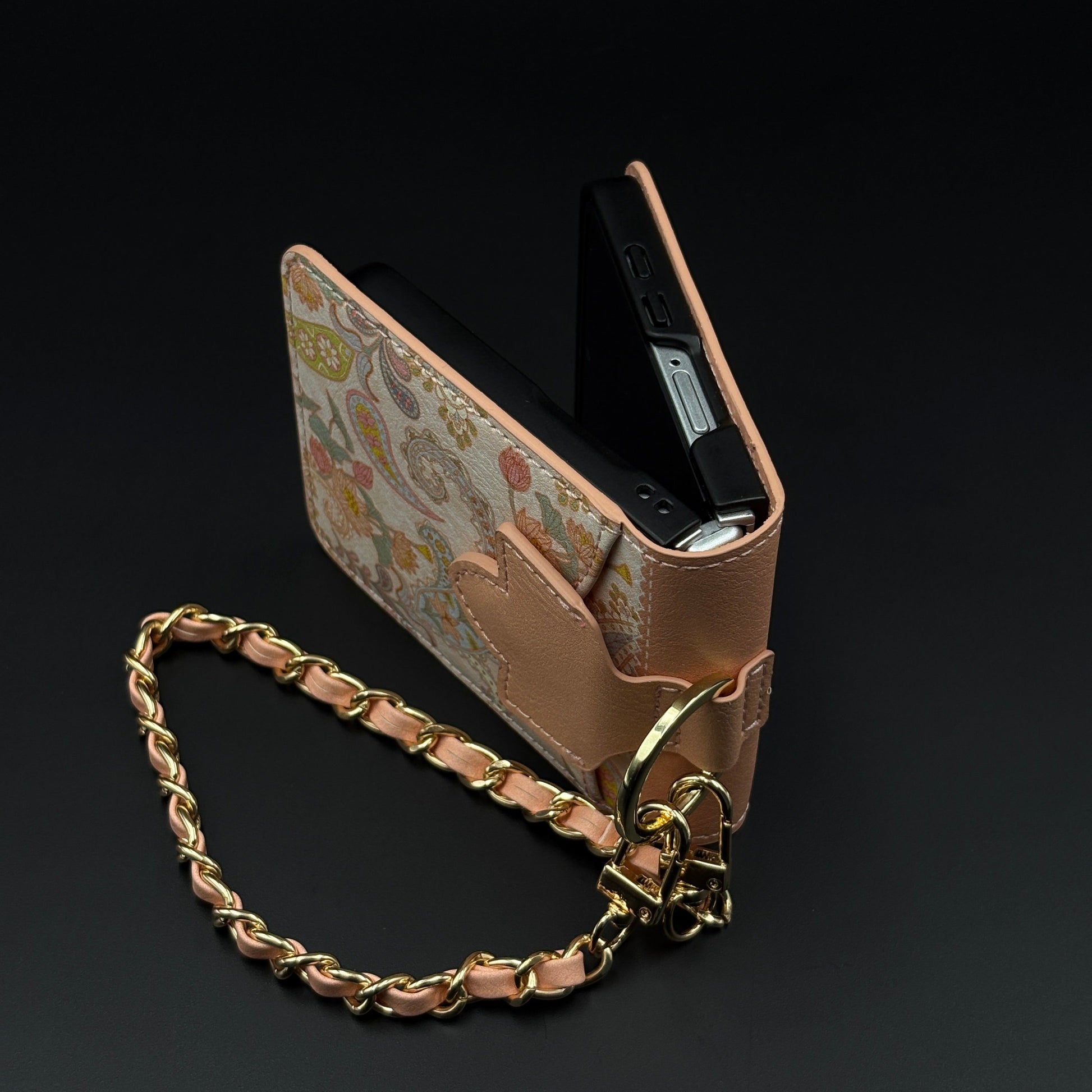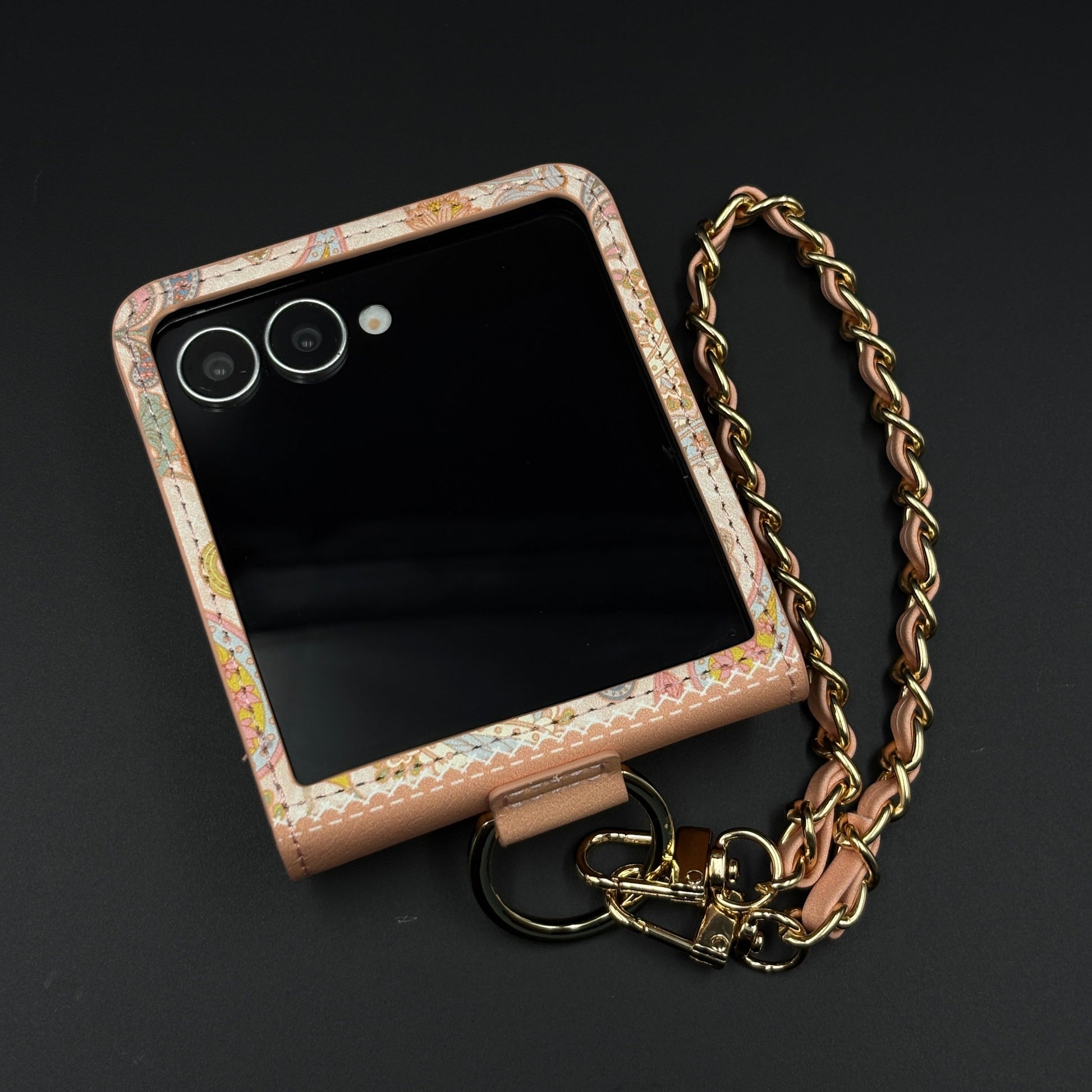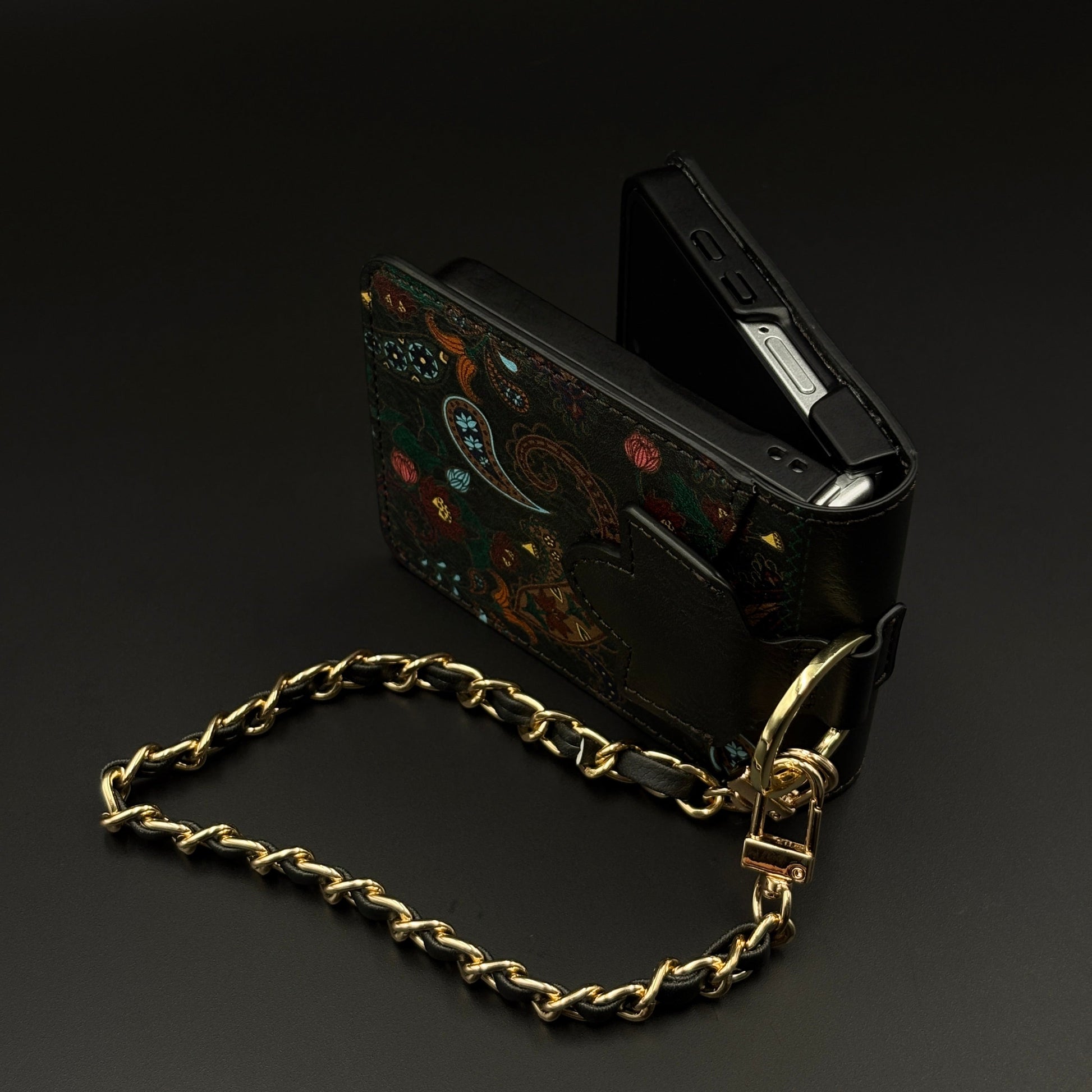 Celebrate the richness of Indian heritage with this beautifully crafted Designer Case for Samsung Galaxy Z Flip 7. Featuring intricate Indian art-inspired paisley patterns, this case brings together traditional aesthetics and modern functionality. Made with premium PU leather and adorned with a detachable gold-accented chain, itβs perfect for those who love bold, ethnic elegance in their everyday essentials. The built-in grip strap adds comfort and practicality for daily use.