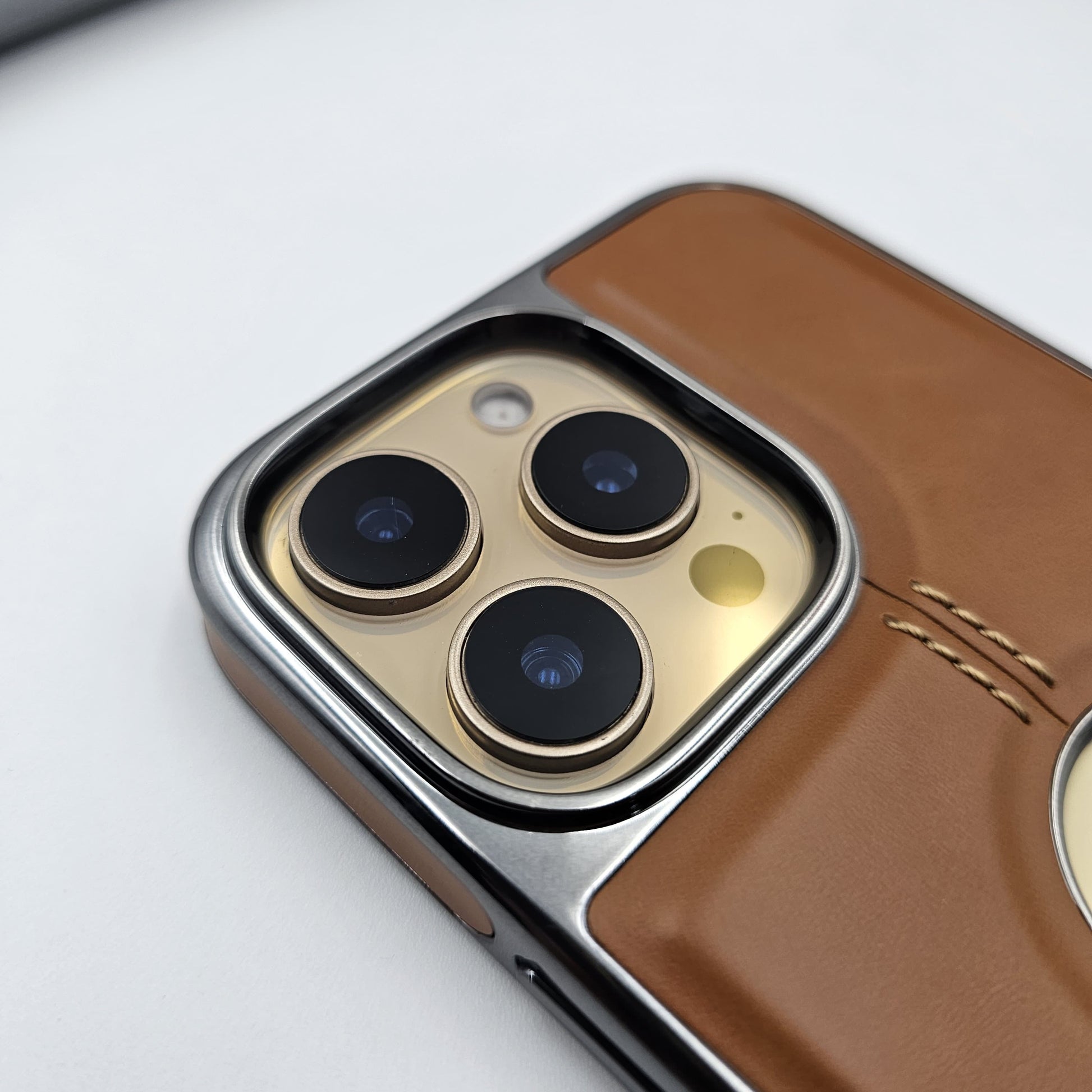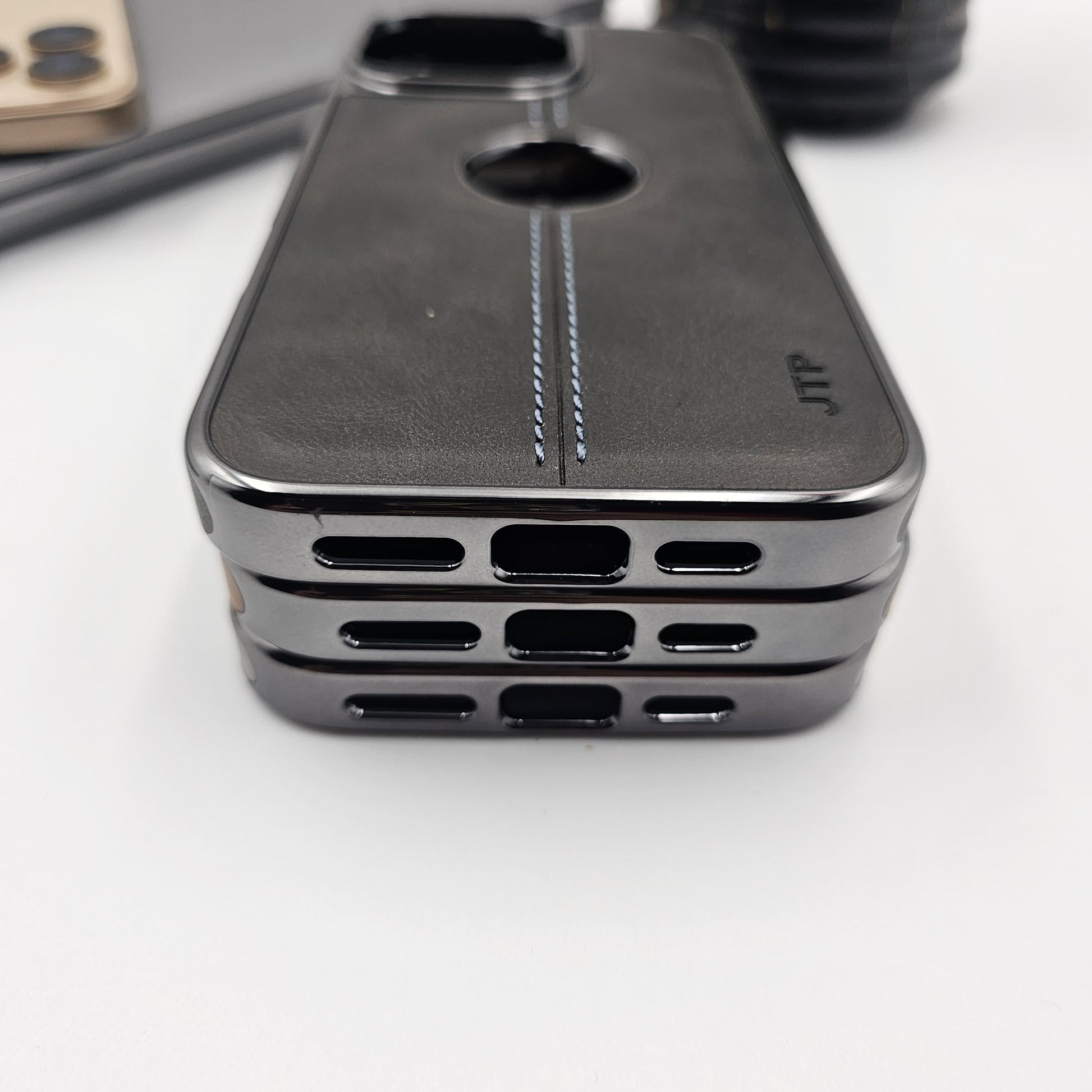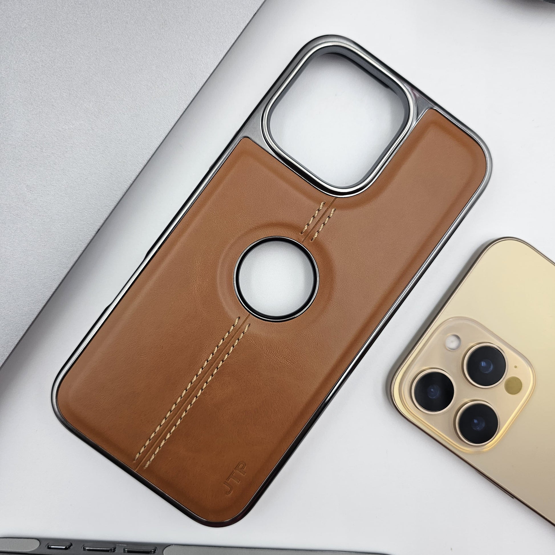 iPhone Logo Cut Centre Stitched PU Leather Chrome Case