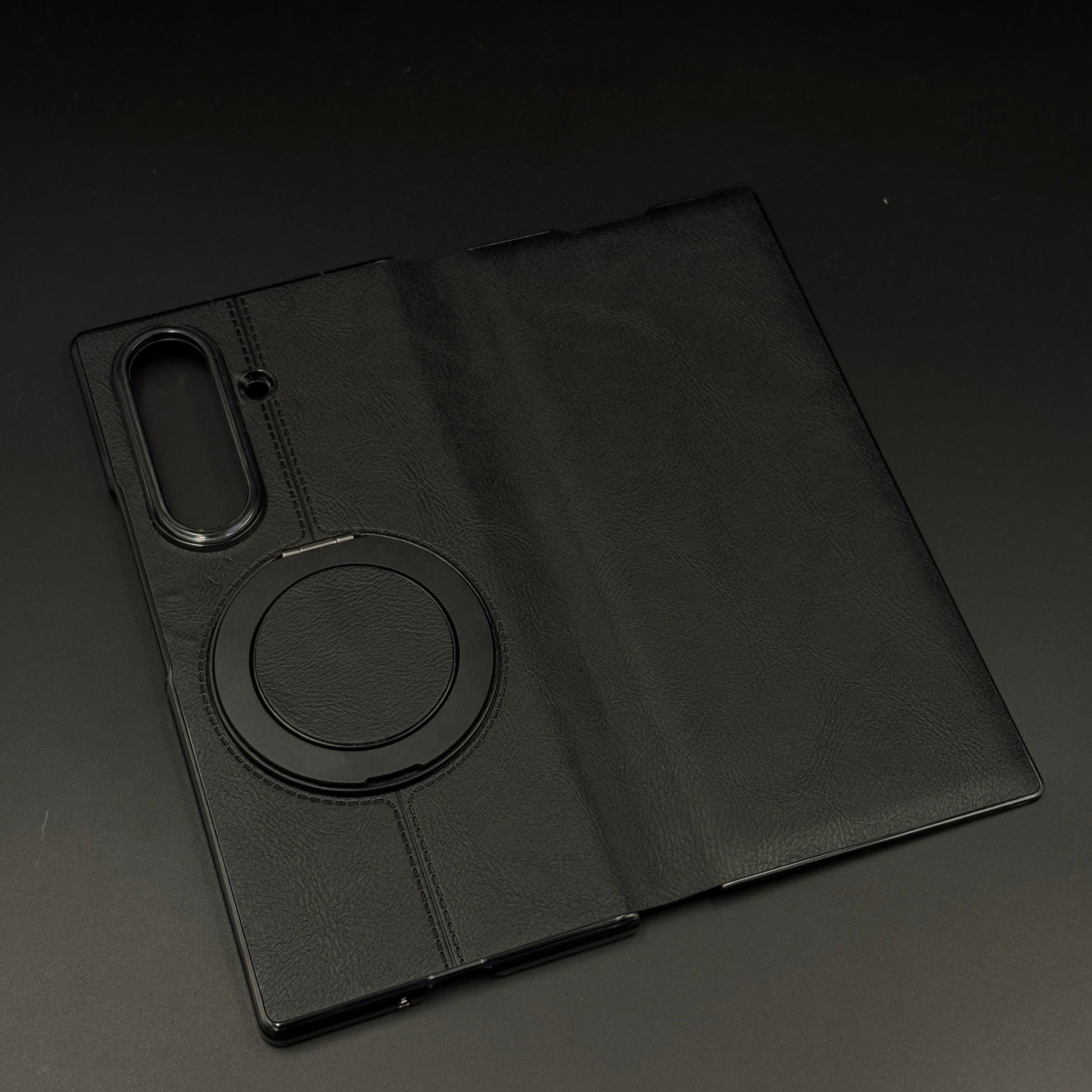 Protect your Galaxy Z Fold 7 in style with this premium leather flip case—featuring a built-in metal rotating stand and hidden MagSafe ring for next-level utility, wireless charging, and everyday sophistication.