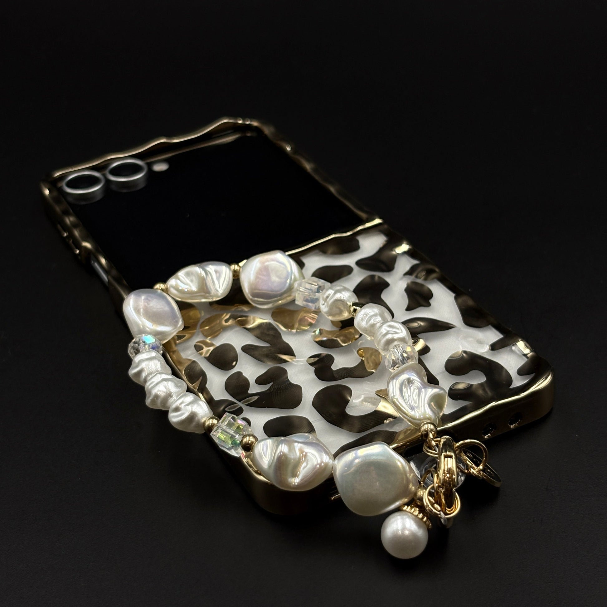 Showcase wild elegance with this striking leopard-pattern case for the Z Flip 7. The gold-and-white sculpted texture, accented by a luxe wrist sling with pearl beads, gives your foldable instant statement style.