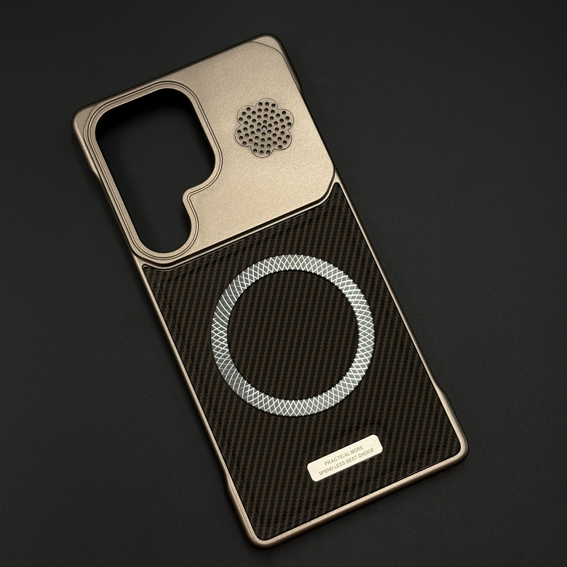 Enjoy luxury and high-tech style with this borderless dual-tone MagSafe case for Samsung Galaxy S25 Ultra. Designed with a modern metallic upper shell and carbon fiber texture below, it delivers premium grip, magnetic convenience, and all-around protection.