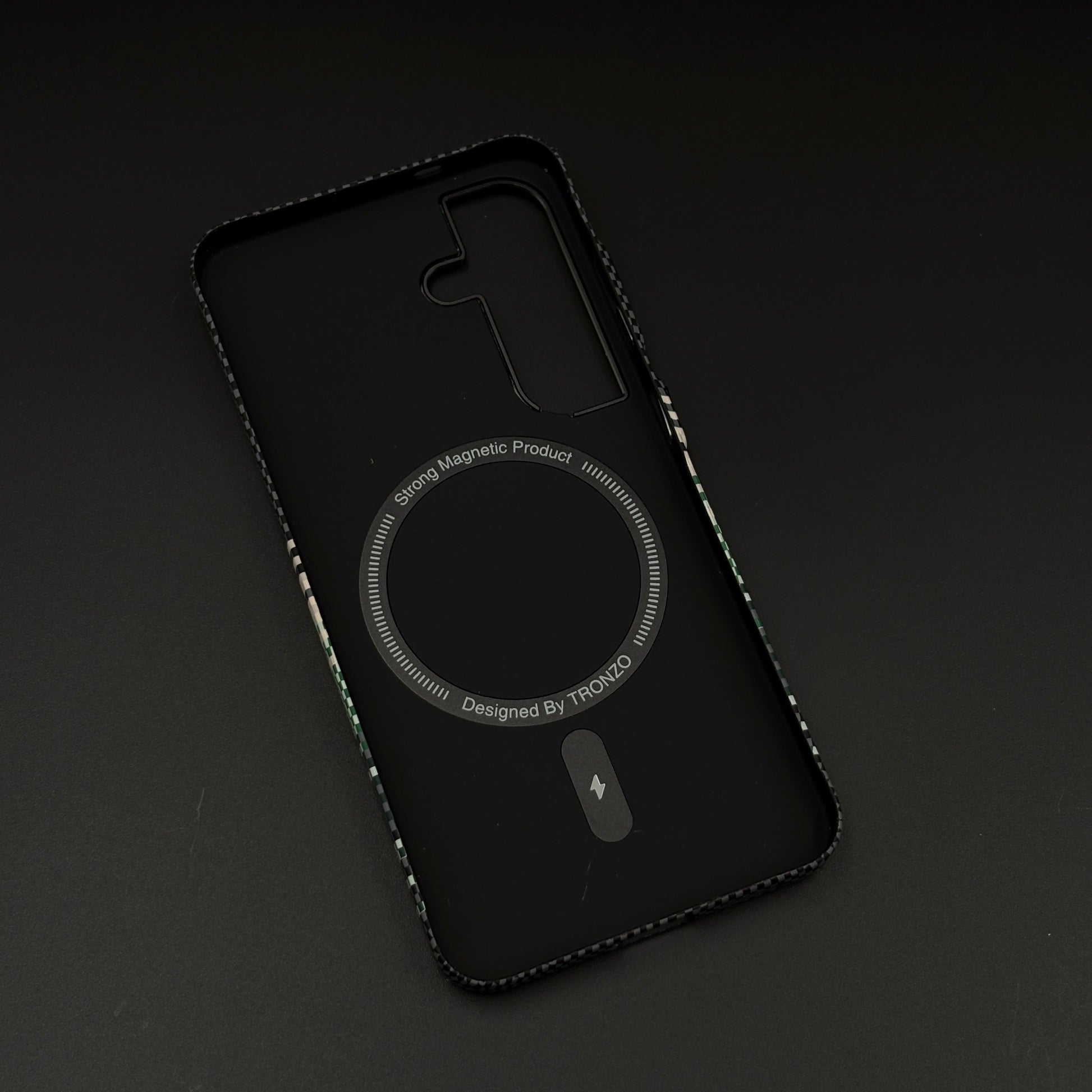 Elevate your Samsung Galaxy S24 | S25 with this contemporary case—featuring a woven carbon fiber texture base with bold horizontal green, black, and cream stripes for a unique, sporty premium aesthetic