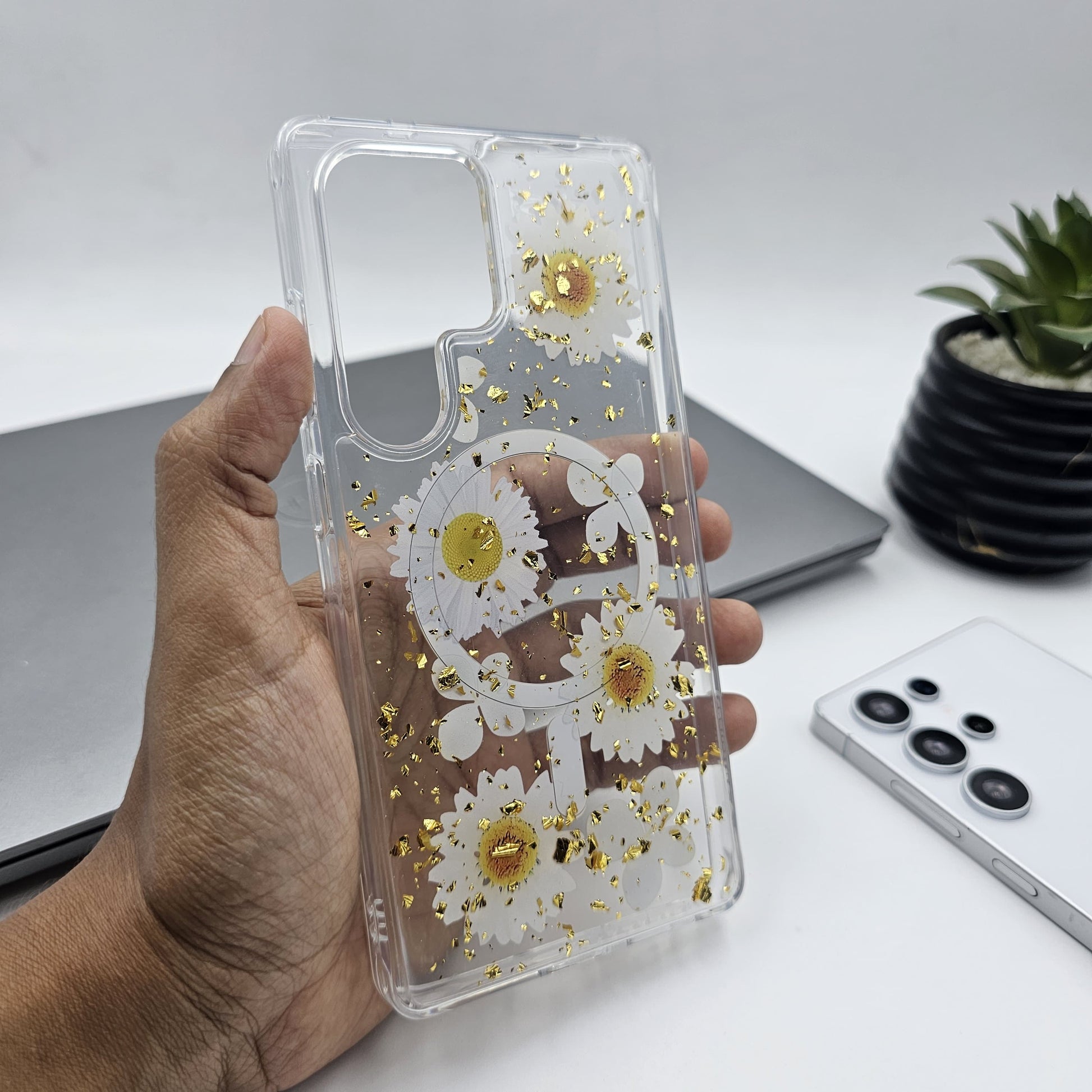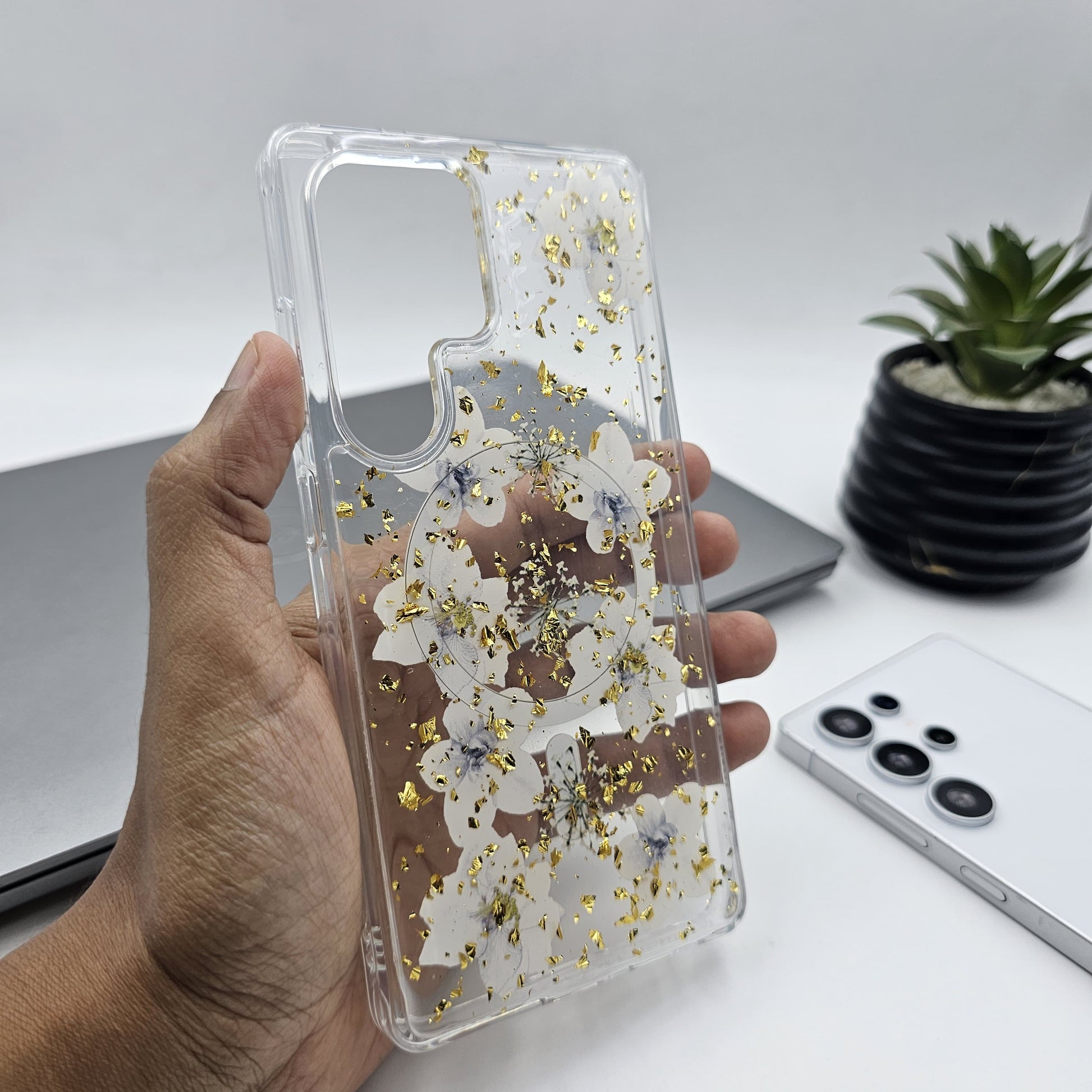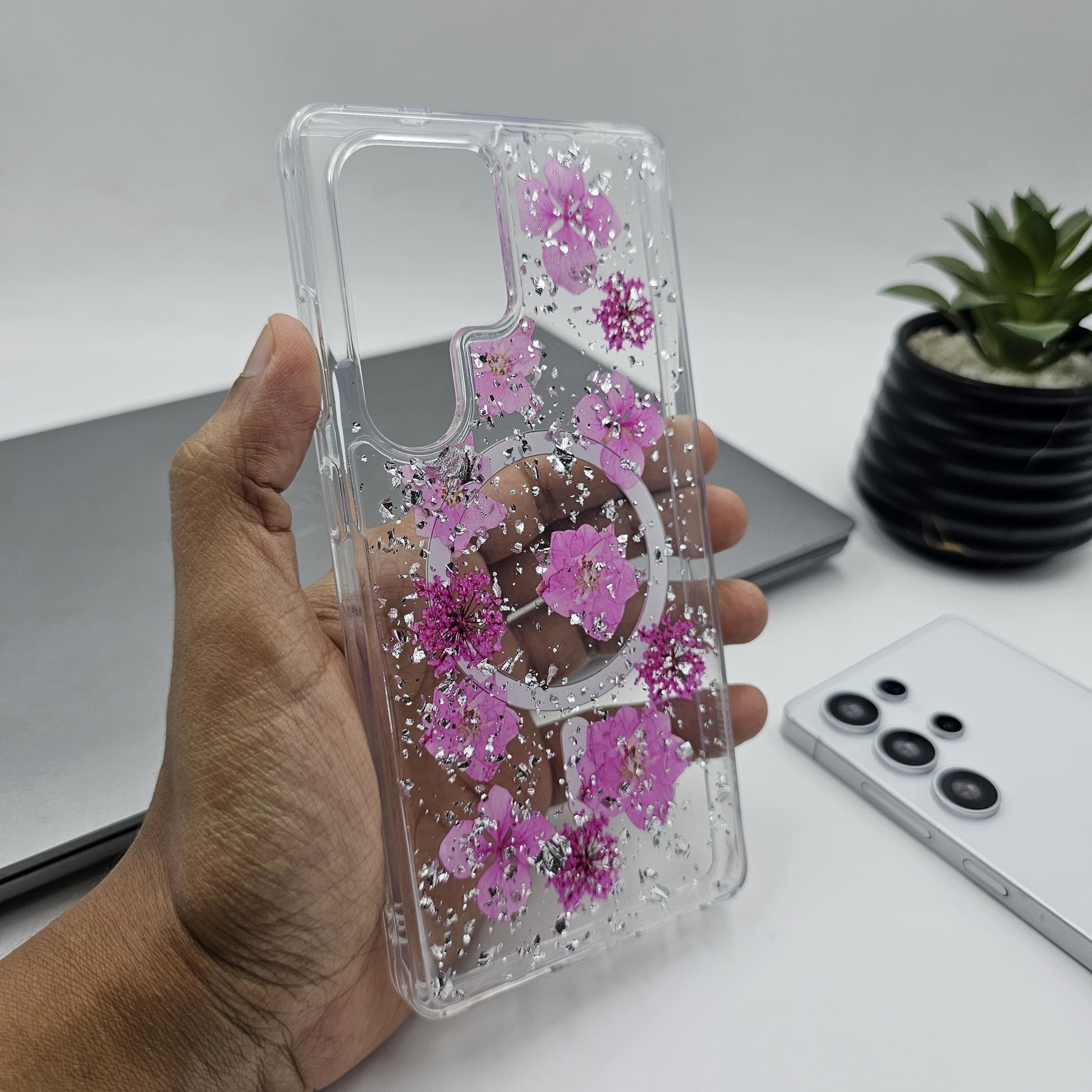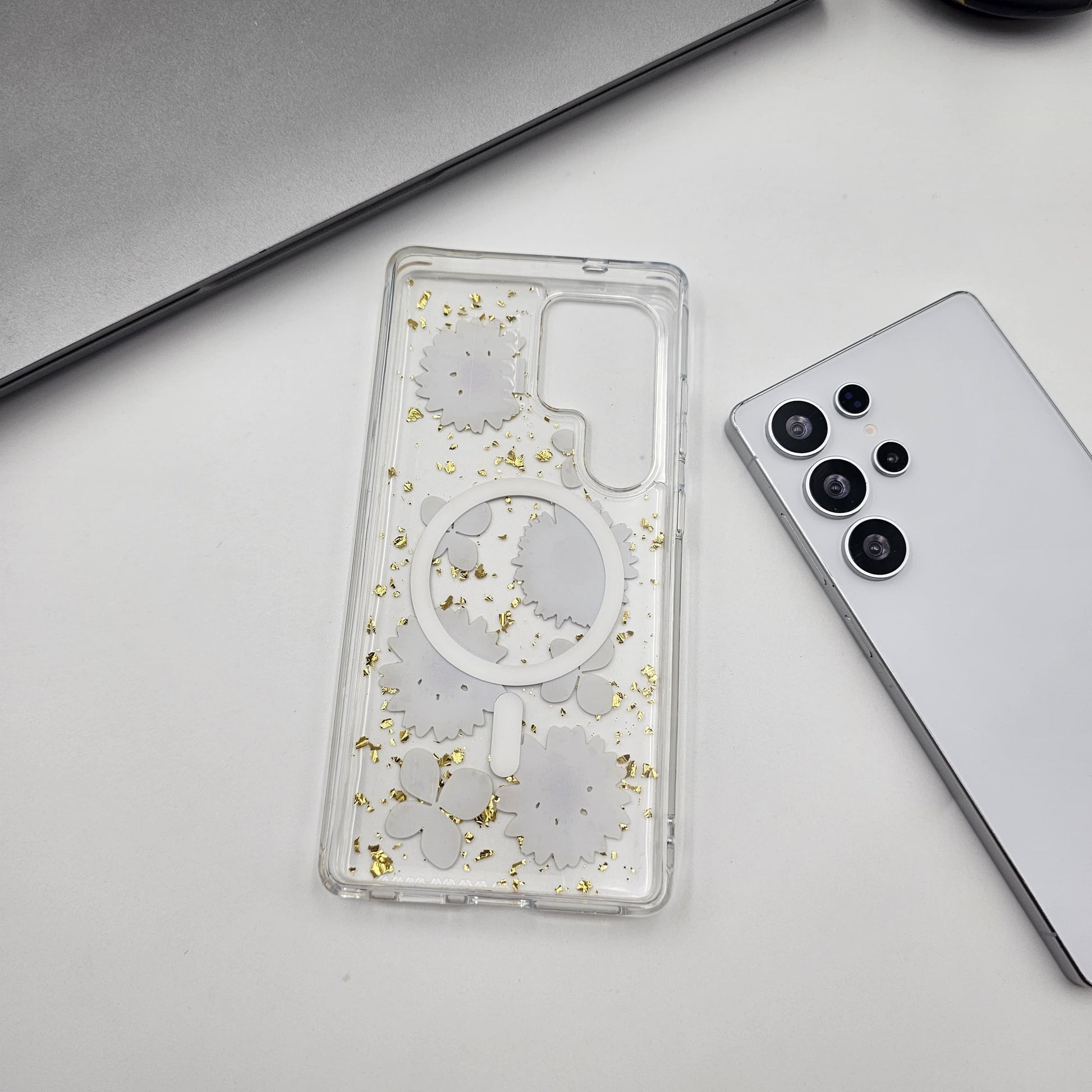 Samsung Galaxy S23 Ultra Floral Non Yellow Glitter Magsafe Silicone Case