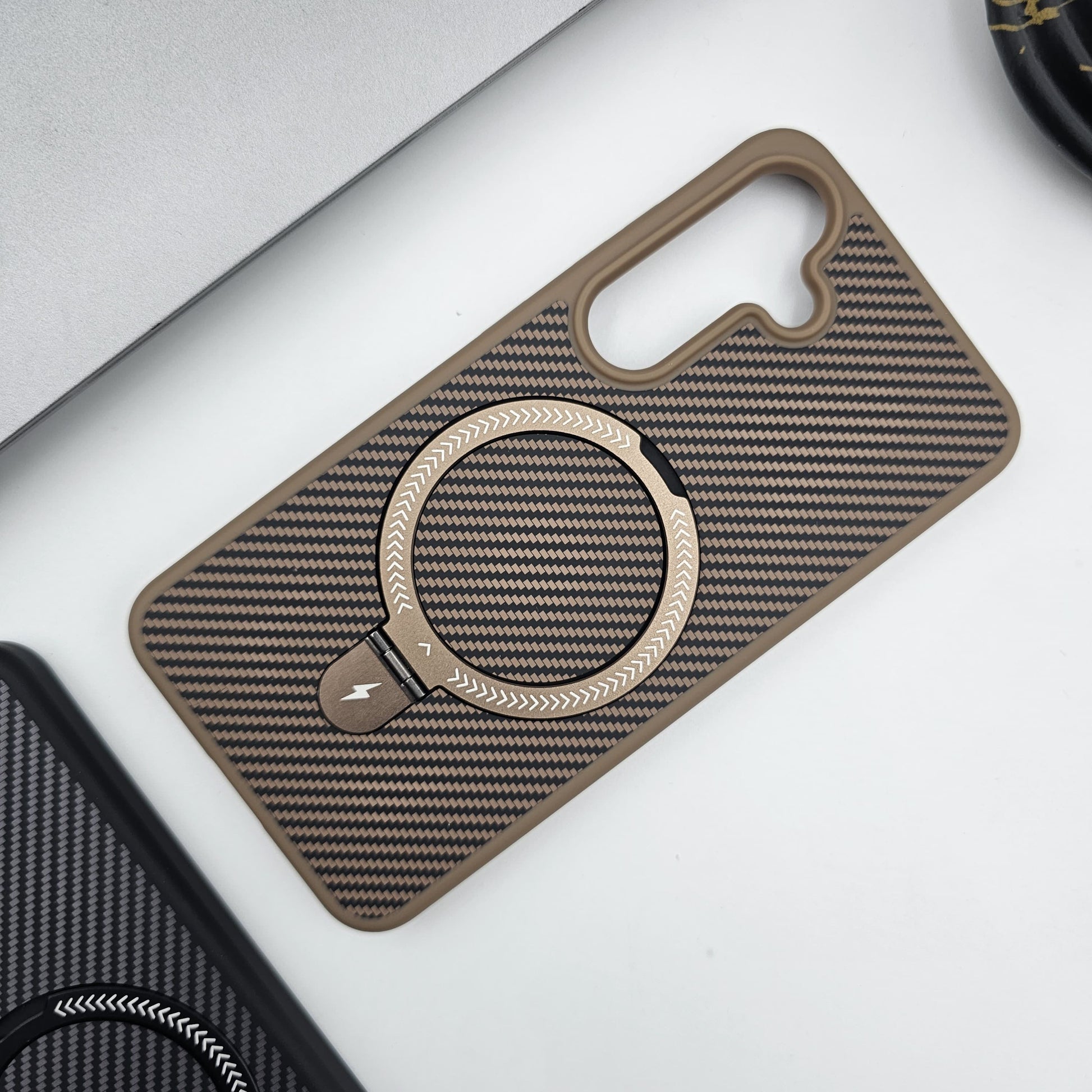 Transform your phone with our premium carbon fiber-inspired case, blending protection and elegance in one. Featuring a robust magnetic ring stand, this case is perfect for hands-free viewing and easy magnetic mounting. The textured finish offers a sophisticated look while ensuring a secure grip.