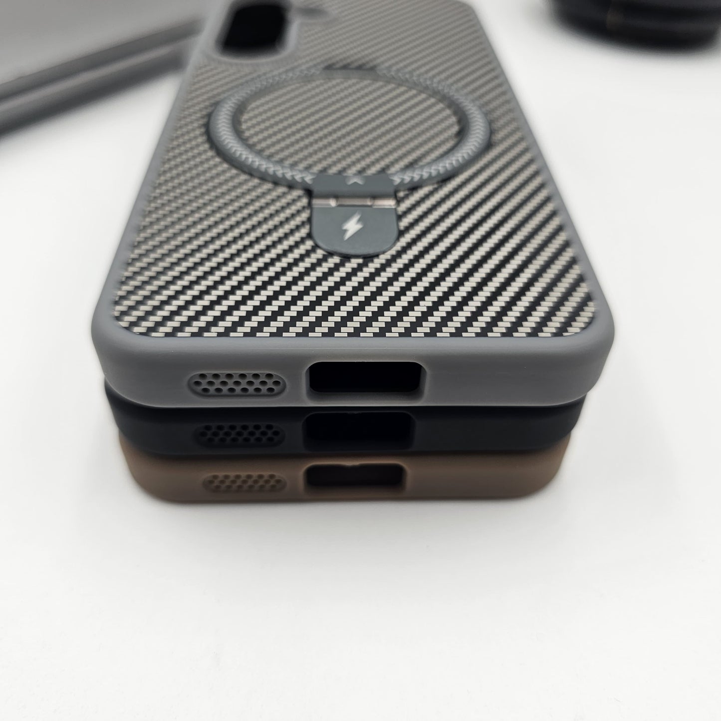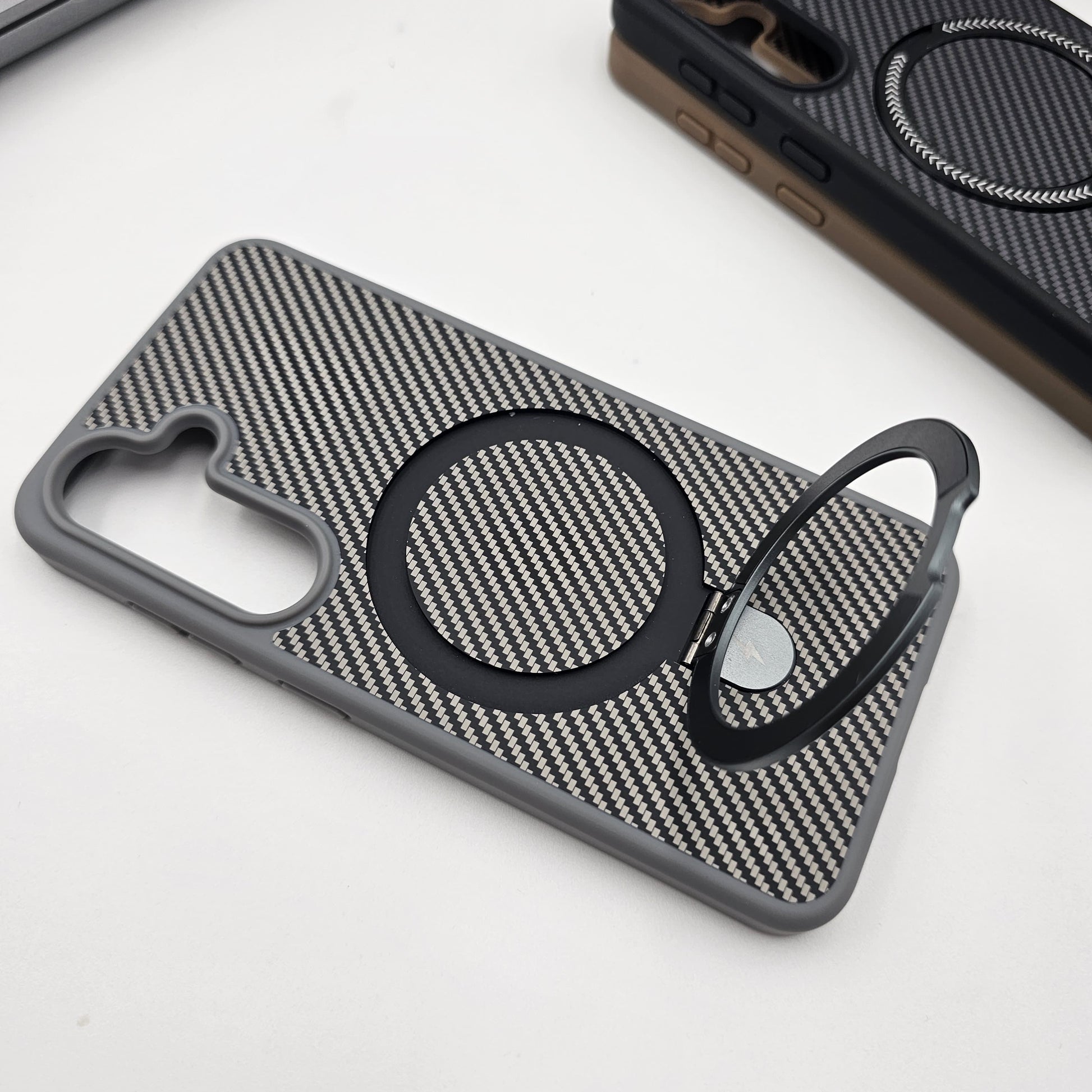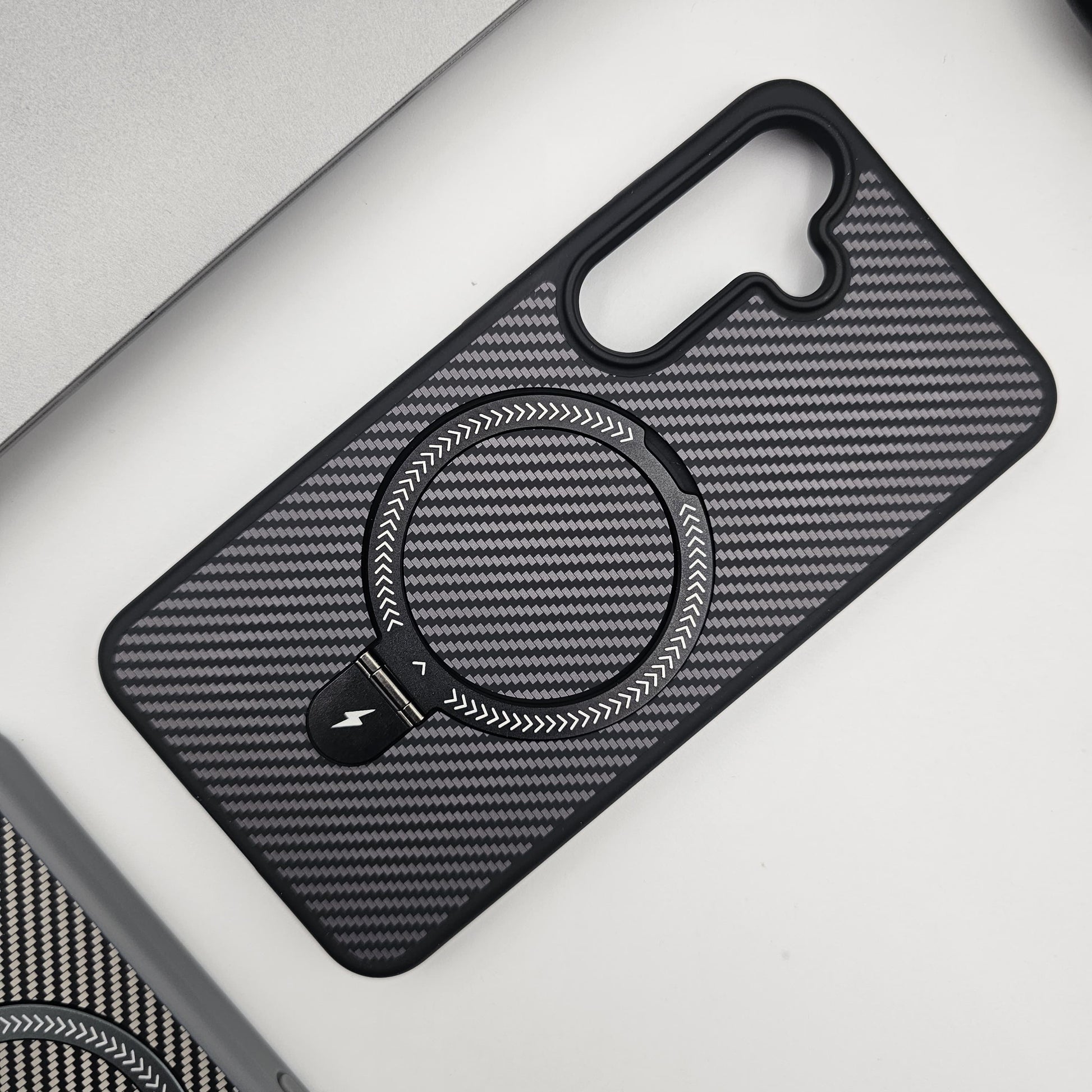 Transform your phone with our premium carbon fiber-inspired case, blending protection and elegance in one. Featuring a robust magnetic ring stand, this case is perfect for hands-free viewing and easy magnetic mounting. The textured finish offers a sophisticated look while ensuring a secure grip.