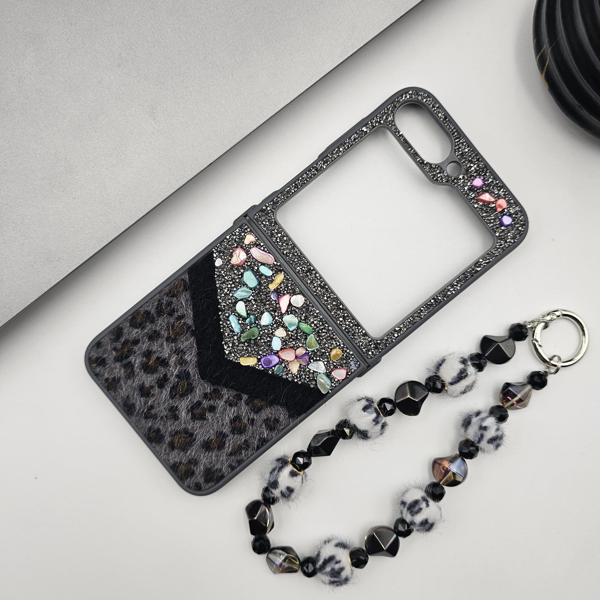 Samsung Galaxy Z Flip 6 Rhinestone Leopard Soft Fur Wristband Sling Case