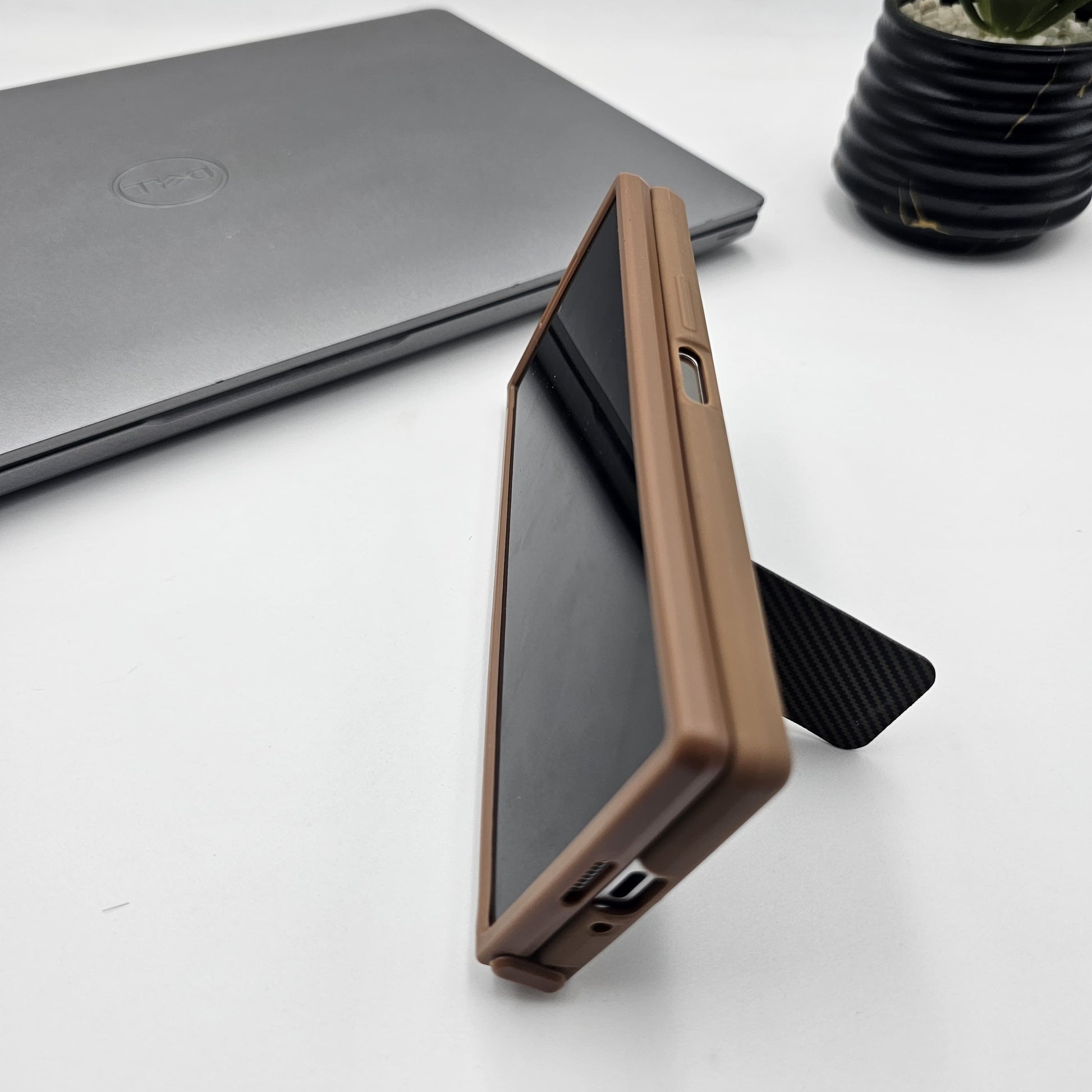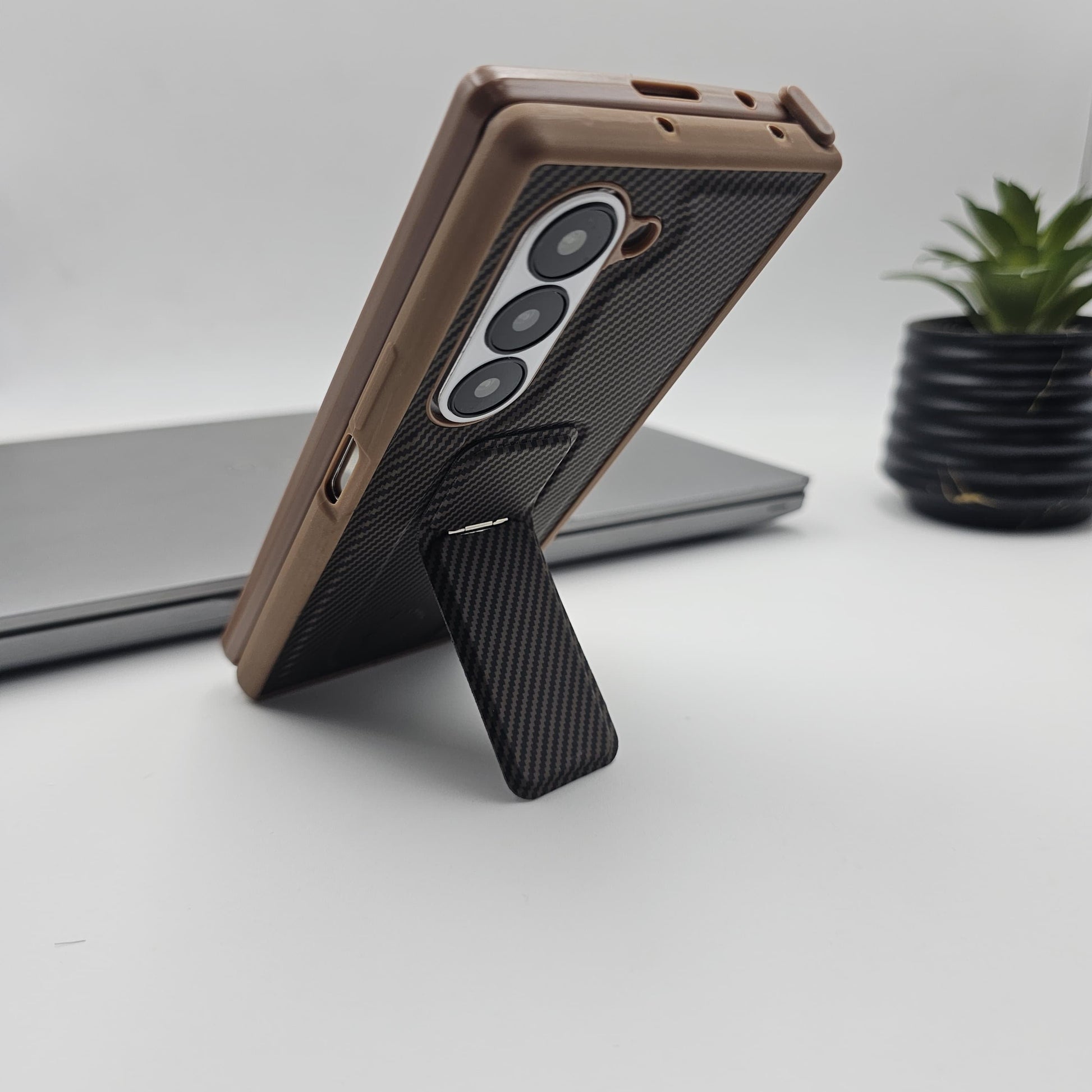 Transform your phone with our premium carbon fiber-inspired case, blending protection and elegance in one. Featuring a robust stand, this case is perfect for hands-free viewing and easy mounting. The textured finish offers a sophisticated look while ensuring a secure grip.