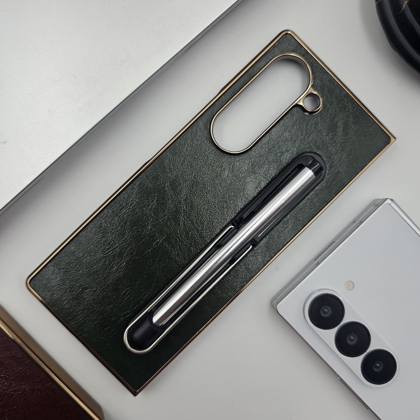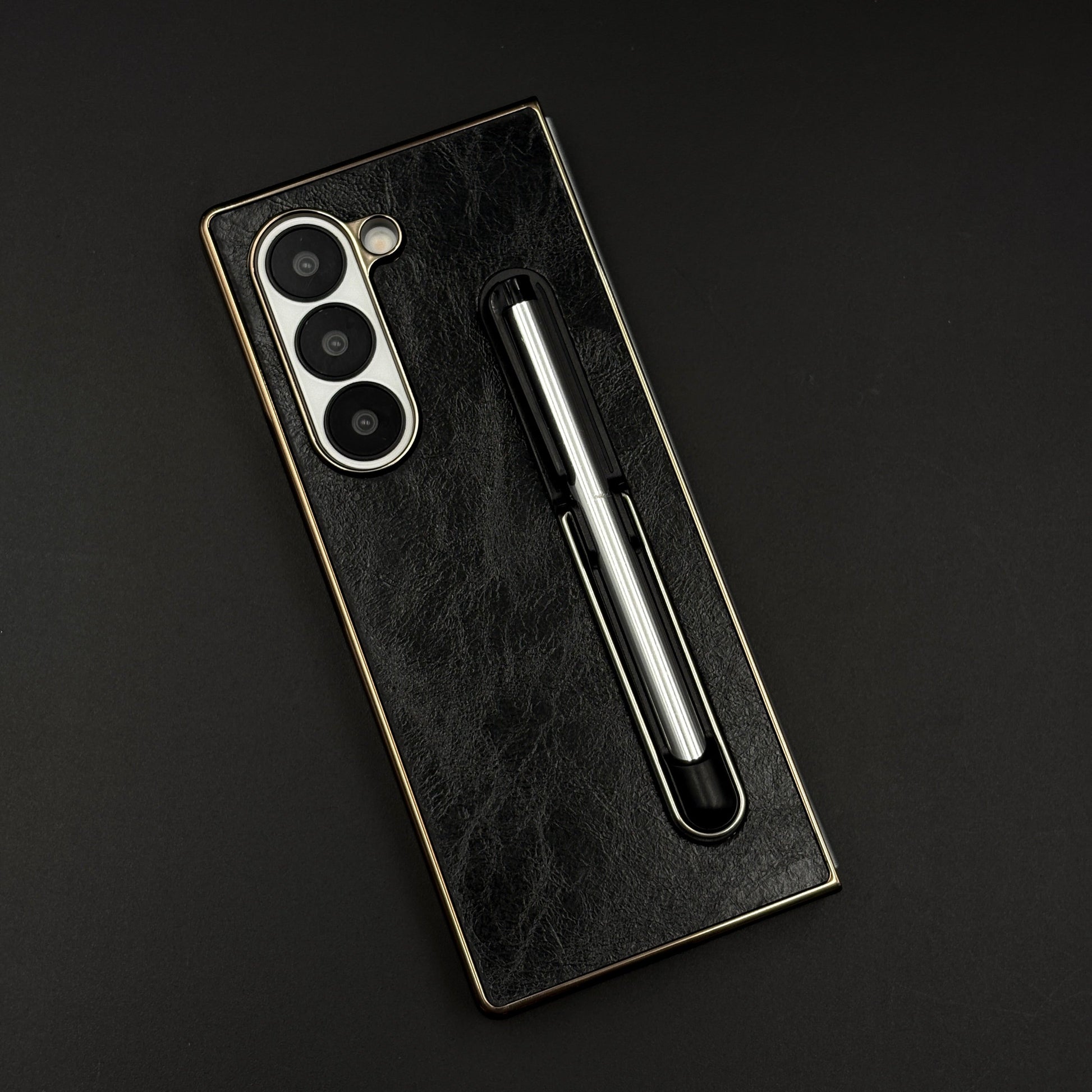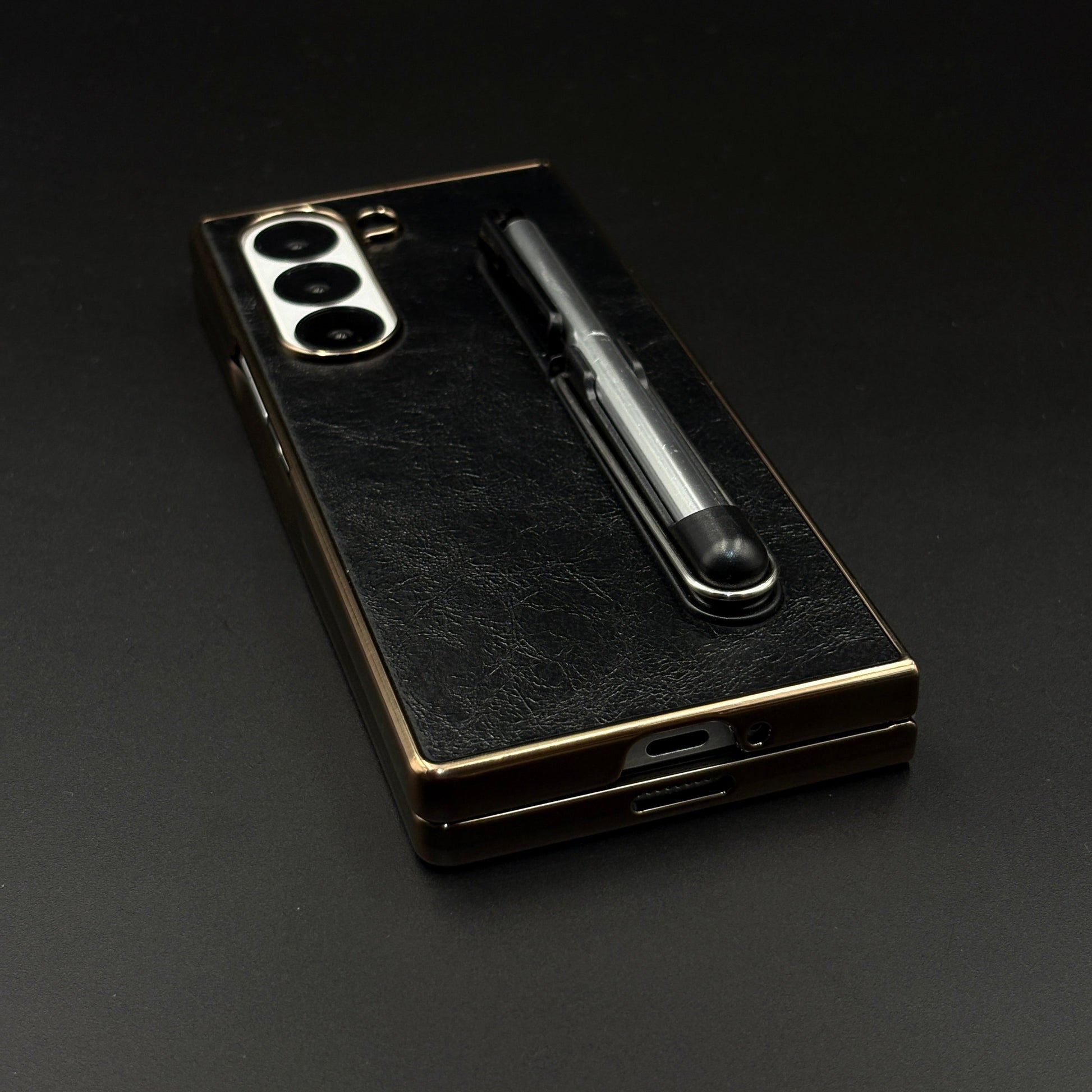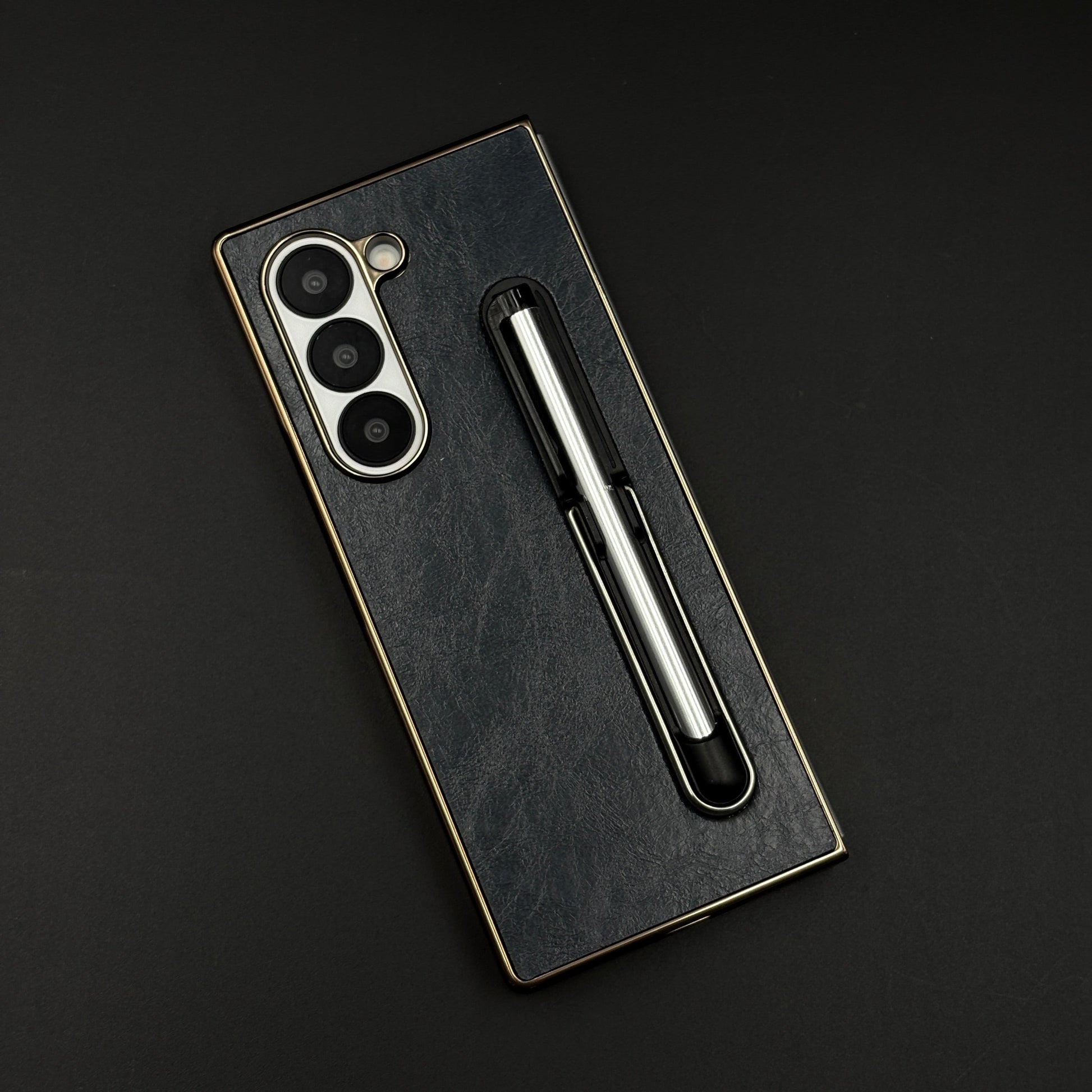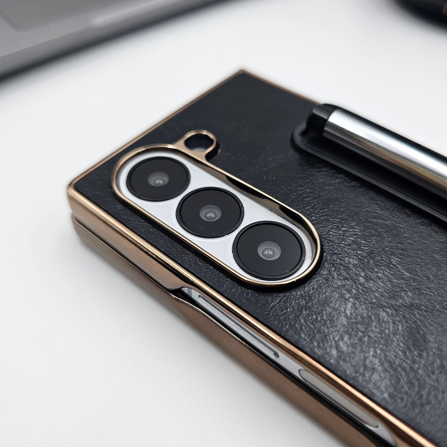 Elevate your Galaxy Z Fold 6 with this PU leather case featuring a luxurious gold chrome plated frame, S Pen holder, and kickstand for style and function.